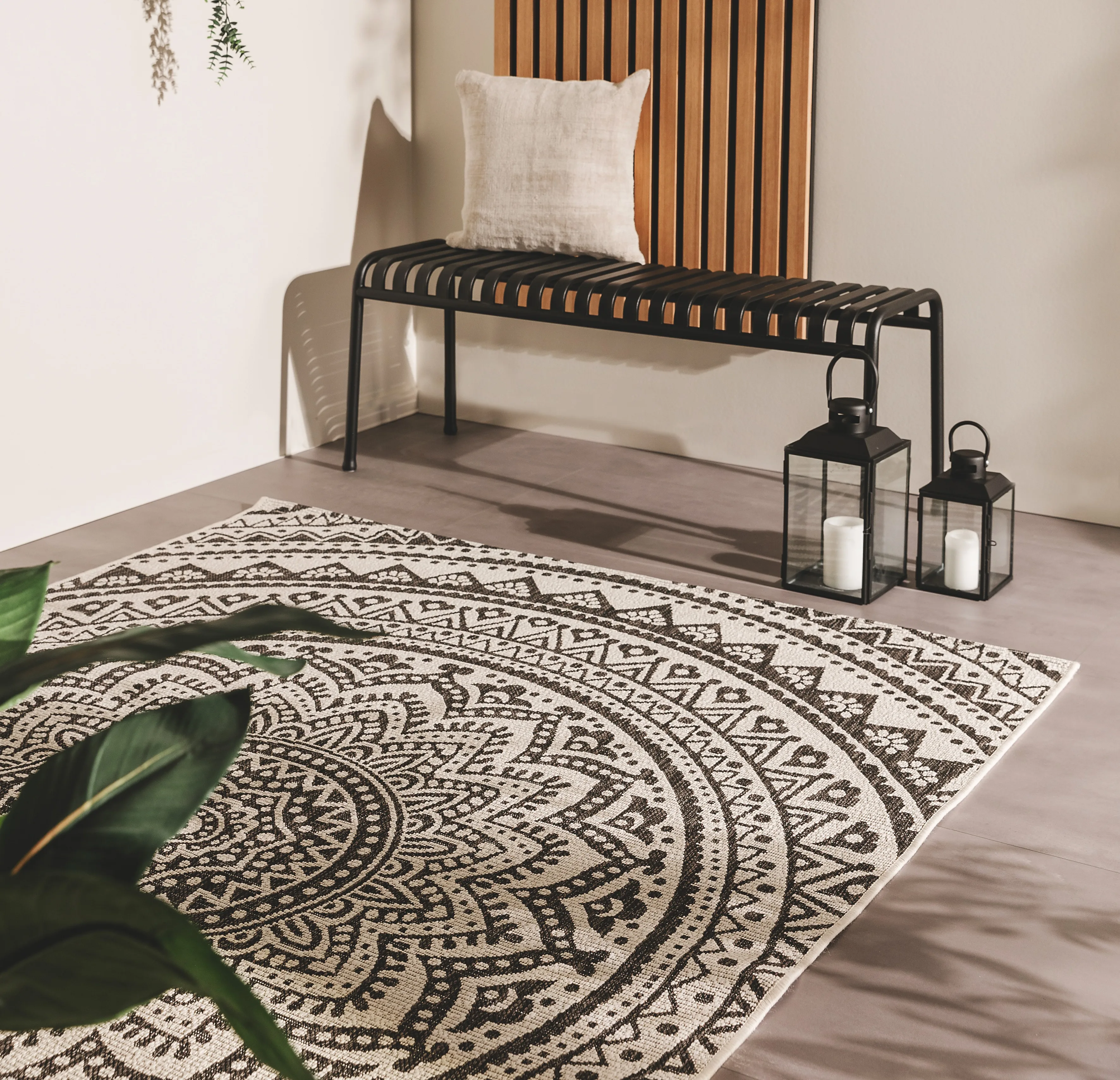 Por qué viajar a lugares lejanos cuando puedes llevar esa sensación de vacaciones al exterior de tu casa con el estilo adecuado. Nuestra lista de control: Alfombras de exterior de inspiración étnica en colores cálidos y naturales y accesorios a juego. ¡Et voila!
